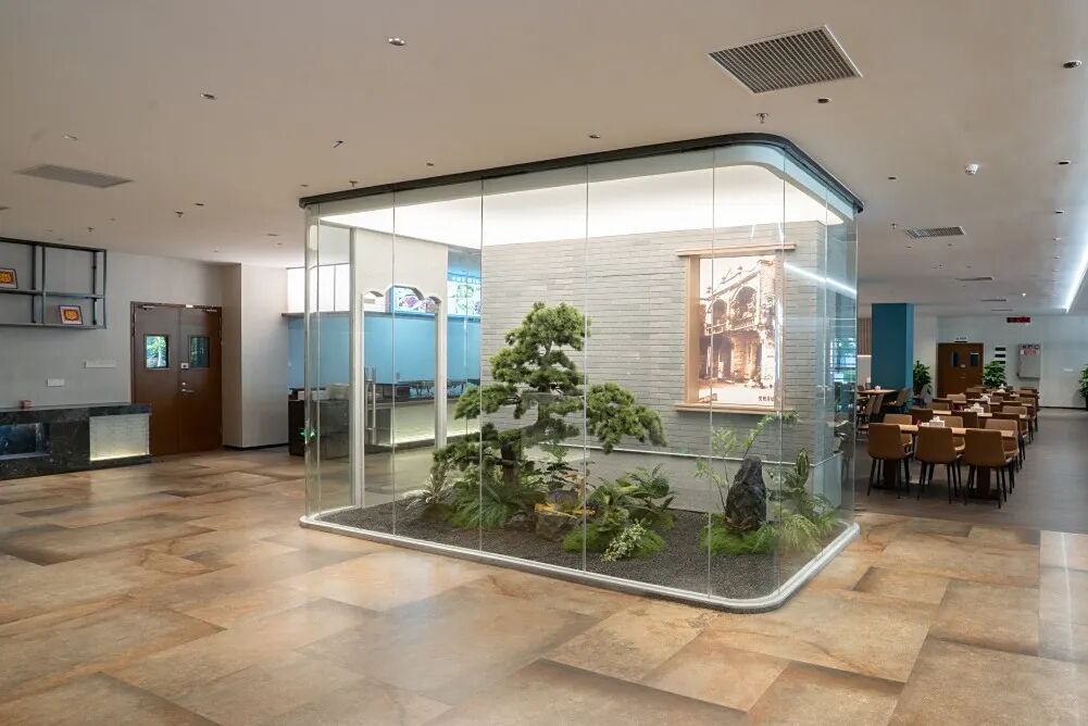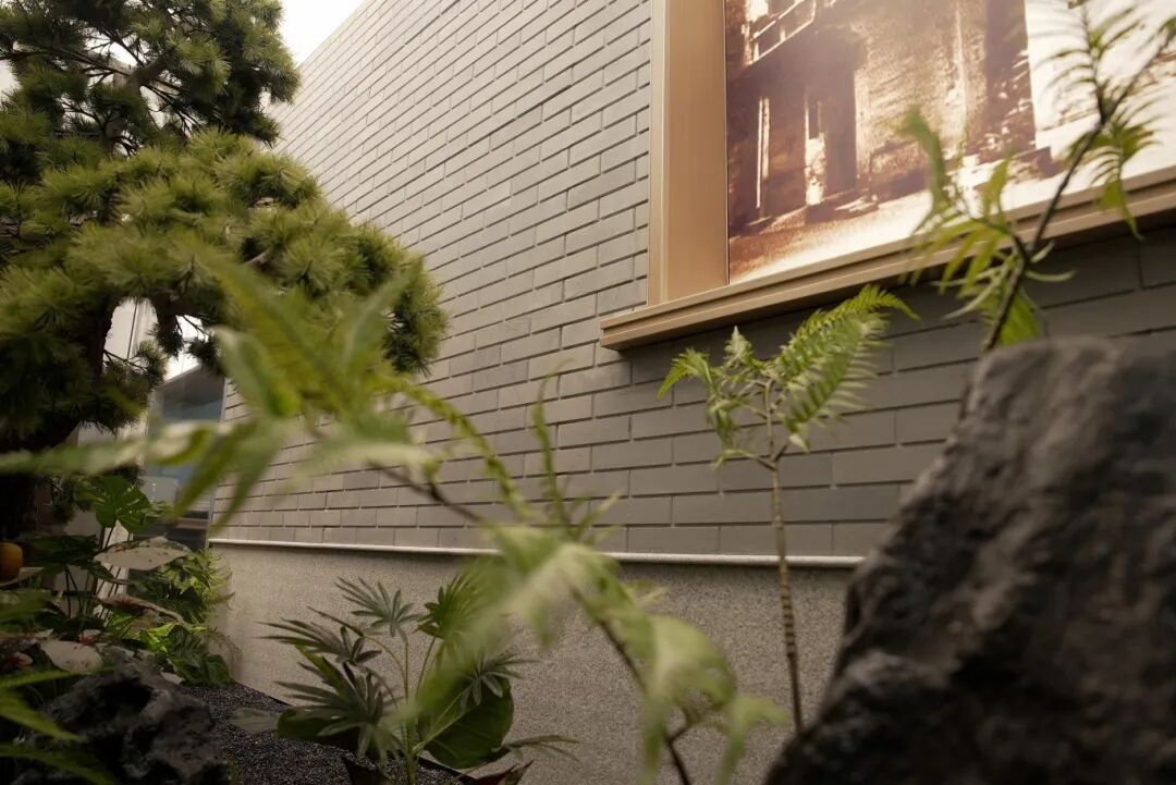 Further in, a transparent glass enclosure reveals a serene landscape. The wall, built from KGE's foamed ceramic wall panels, exudes a composed Lingnan charm with its rustic grey hue and fine texture.