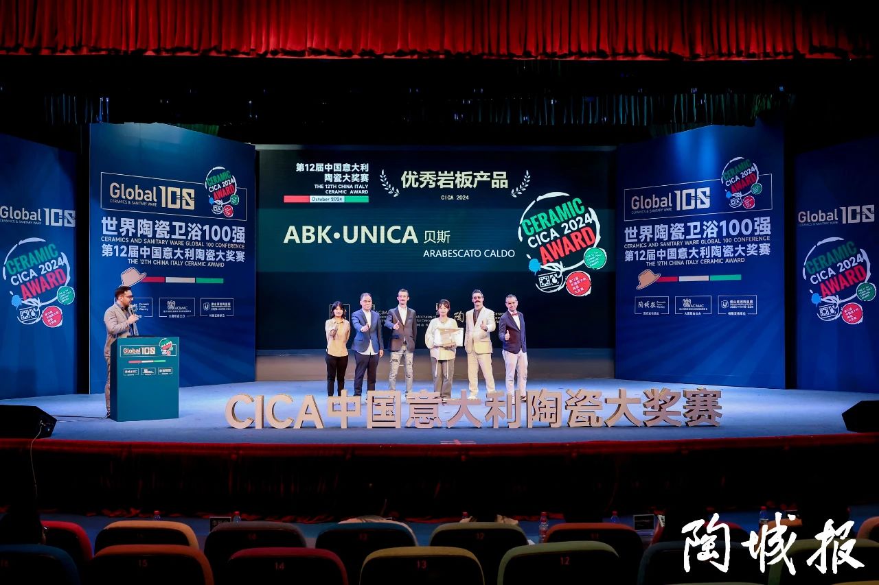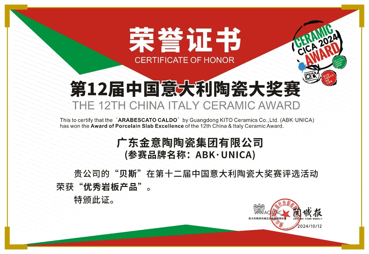 On October 12, 2024, the award ceremony for the 12th China Italy Ceramic Award took place in Foshan. In this competition, high-end products from China tiles manufacturer KITO and Italian brand UNICA, a premium porcelain slab brand under the ABK Group, won two well-deserved honors: the "Gold Award for Creative Design" and the "Outstanding Porcelain Slab Product" award. These accolades were earned thanks to the latest application of 3D TECH technology, combined with cutting-edge design concepts and striking product aesthetics.