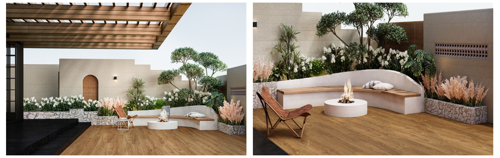 This villa is based on an earthen color palette, with the courtyard featuring meticulously crafted elements like rocks, plants, and pavilions designed by the homeowner and the designer. The rugged sand-textured outdoor tiles, realistic wood villa glazed porcelain tile Keywood, and hollowed-out artistic components form a simple yet elegant backdrop. The blooming flowers fill the entire courtyard, enhancing the serene and graceful atmosphere. Life here unfolds in a continuous, repetitive cycle, with surprising blossoms emerging continuously.