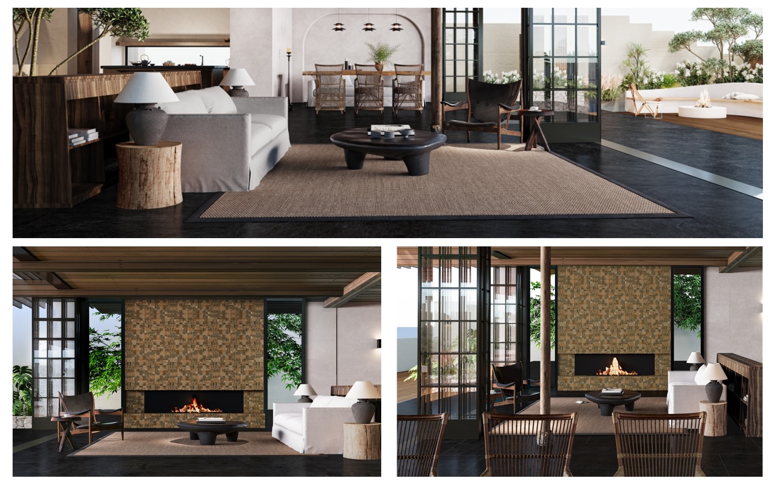 The golden, vibrant geometric tiles on the feature wall exude artistic flair, adding a dynamic touch to the space. The flickering flames in the fireplace cast a warm, orange-red glow on everyone’s faces, creating a cozy and inviting atmosphere. A captivating space always embodies tranquility, offering a deep sense of security that brings profound inner peace.