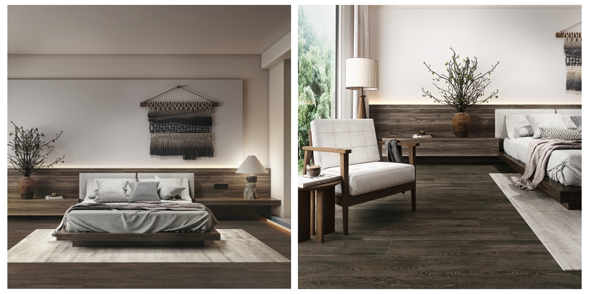 The Keywood glazed tile flooring harmonizes with the bedside table and wall, featuring a minimalist design that seamlessly blends with the natural surroundings. Every detail reflects the thoughtfulness and taste invested in the home, offering the residents a sense of warmth and belonging.