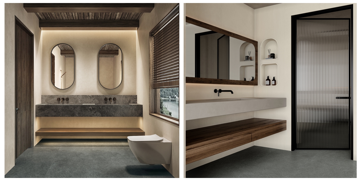 In the bathroom, the KITO Infinite Silver villa glazed porcelain tile on the floor is paired with the delicate Silver Beach tiles on the walls, creating a sophisticated and understated expression of refinement.