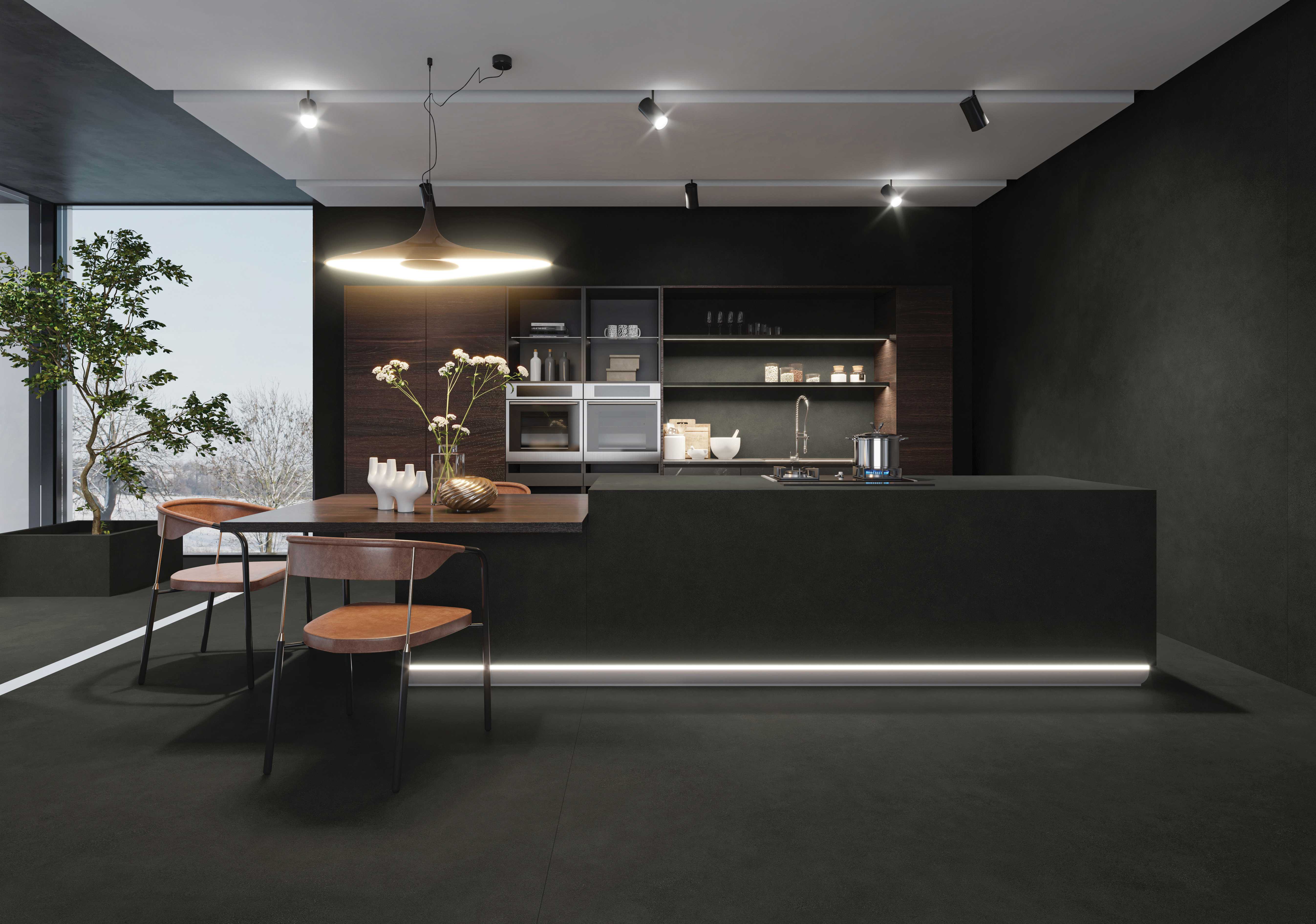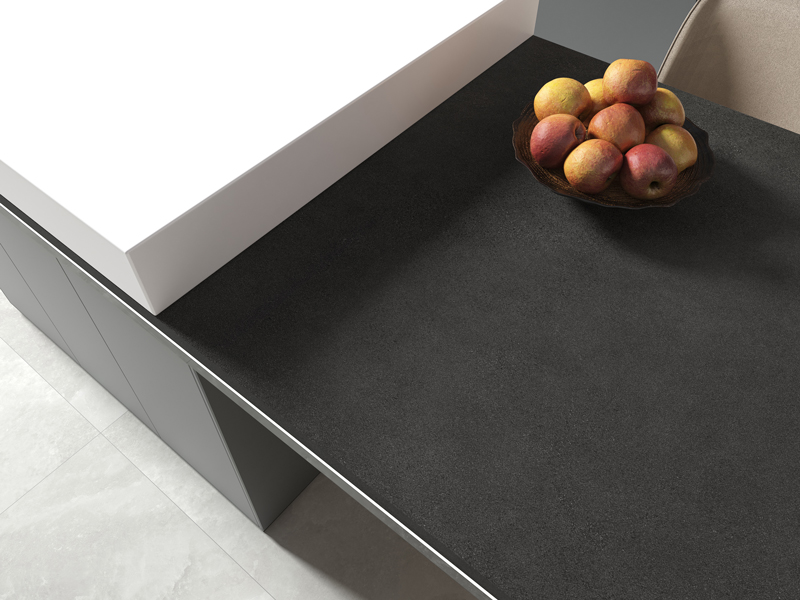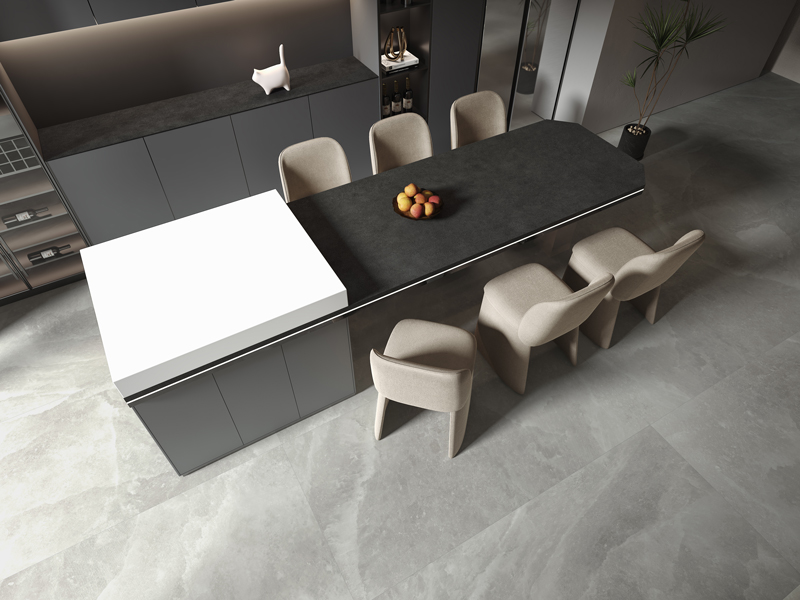KITO AGED BLACK porcelain slab – a blend of elegance and simplicity inspired by the fluidity of water. It incorporates elements like cement, sand, gravel, and terrazzo, offering a minimalist aesthetic with exquisite grey tones. It is the preferred Kitchen Island worktop and backsplash panel.