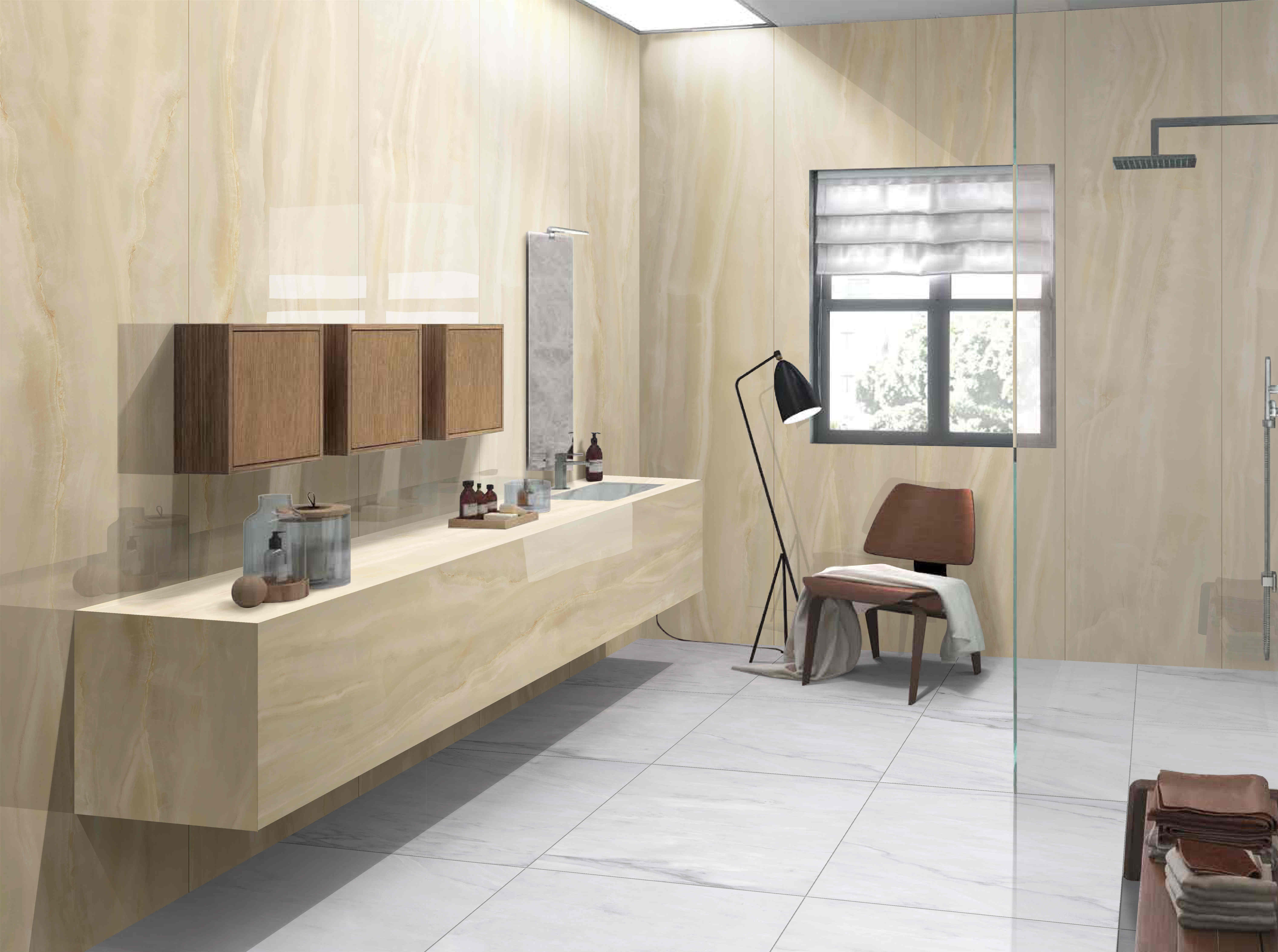 Introducing the Alabaster Light Series Porcelain Tiles from KITO, a leading tile flooring manufacturer. Our avant-garde 3D inkjet printing technology takes center stage, meticulously restoring the intricate texture of natural jade. Witness strands of gold, the artful dance of white forging, and the intertwining of grey veins, all captured with unparalleled precision.