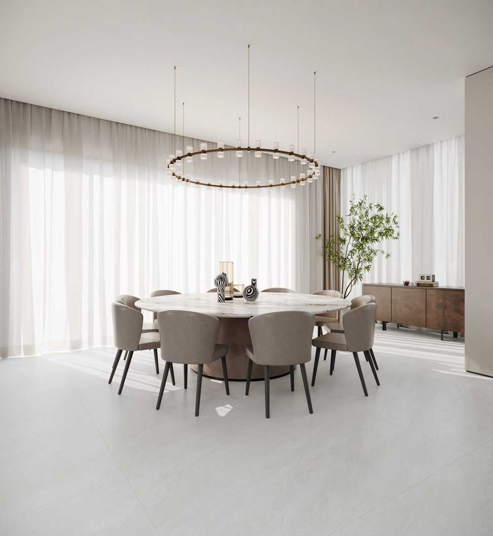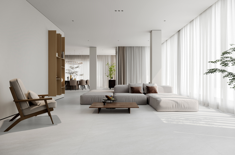 The graceful warm gray tone evokes sandstone kissed by sunlight, with subtle hints of off-white and light brown naturally interwoven. It creates a foundation that is warm, refined, and composed.