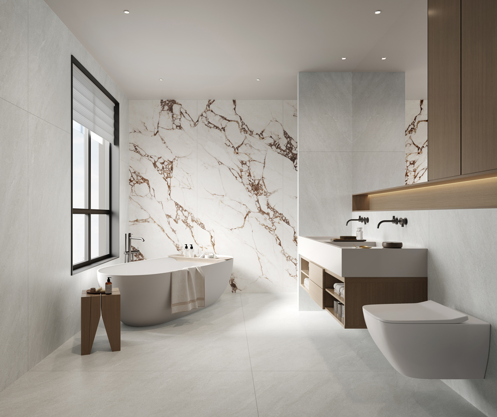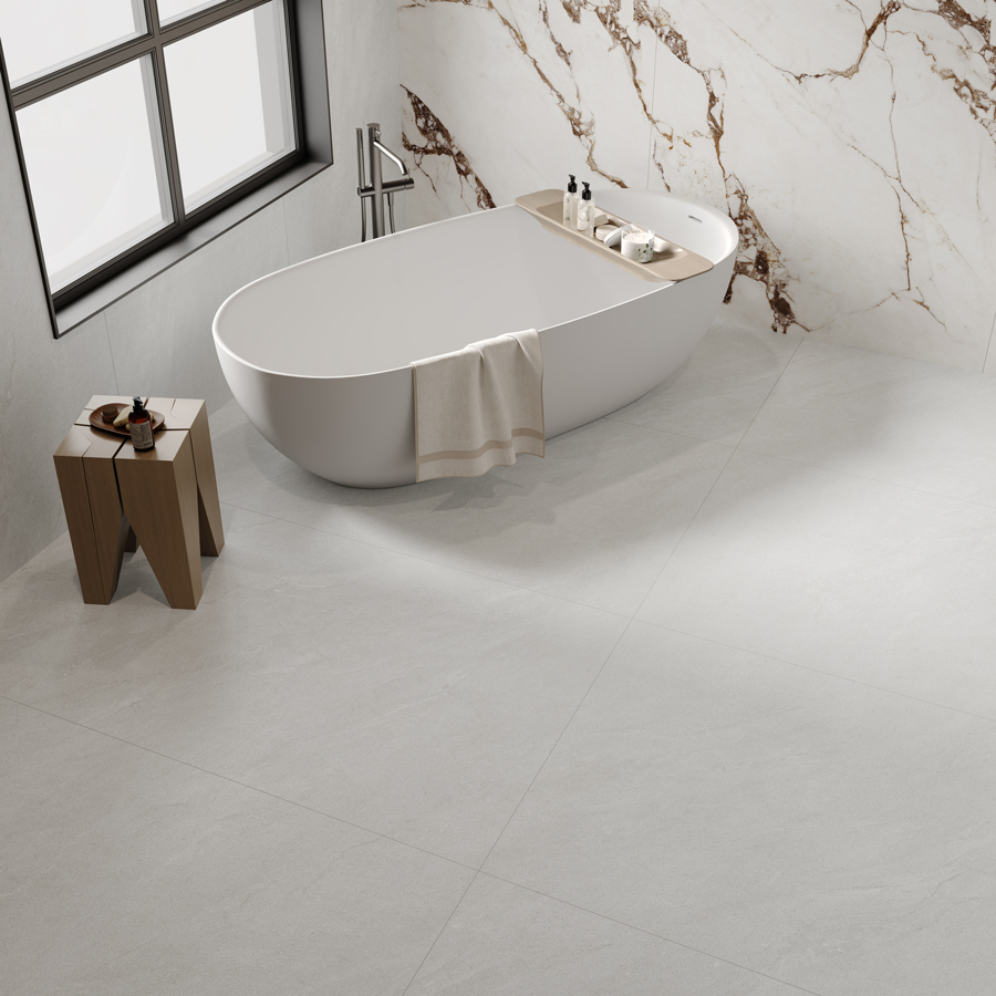 Drawing inspiration from the sandy shores of Queensland's Gold Coast, this Austin Bianco ceramics tile collection captures the layered texture of natural sandstone. The veining is soft, fluid, and rich in natural variation.