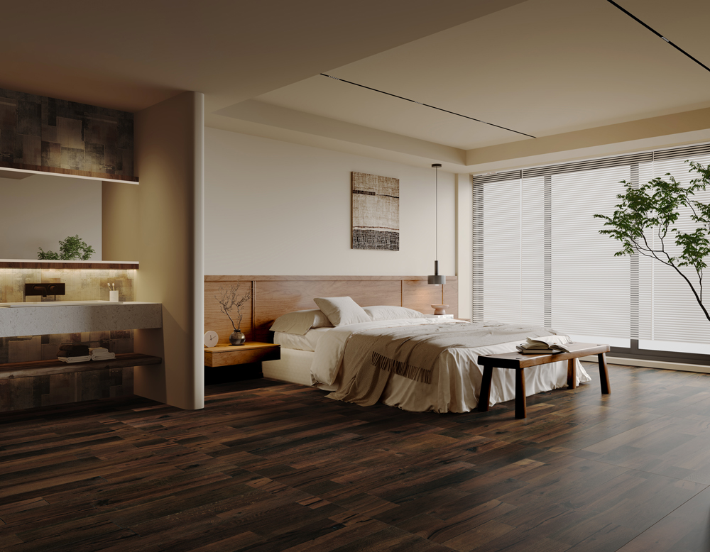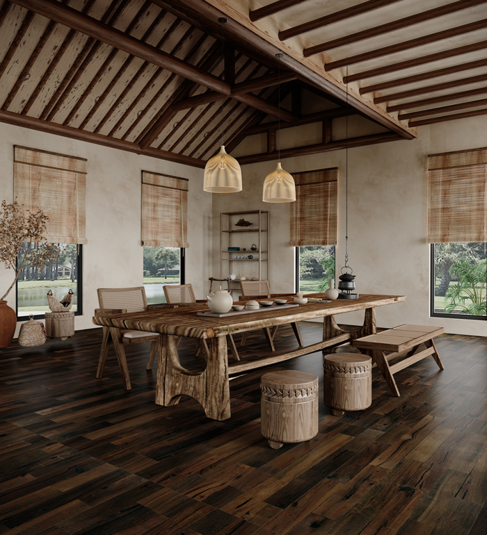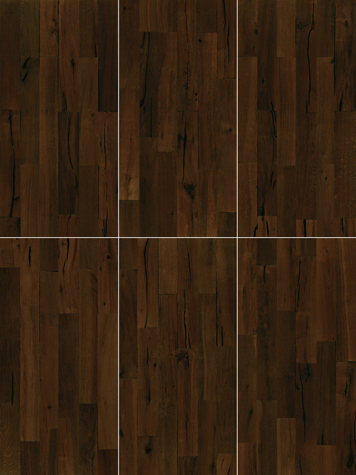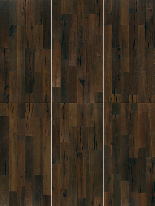 Rich shades of warm brown and vintage deep gray are accentuated by subtle gradations of light and shadow, along with subtly reddish aged tones. Deep cracks and knots add bold contrast, enhancing the collection's distinctive character.