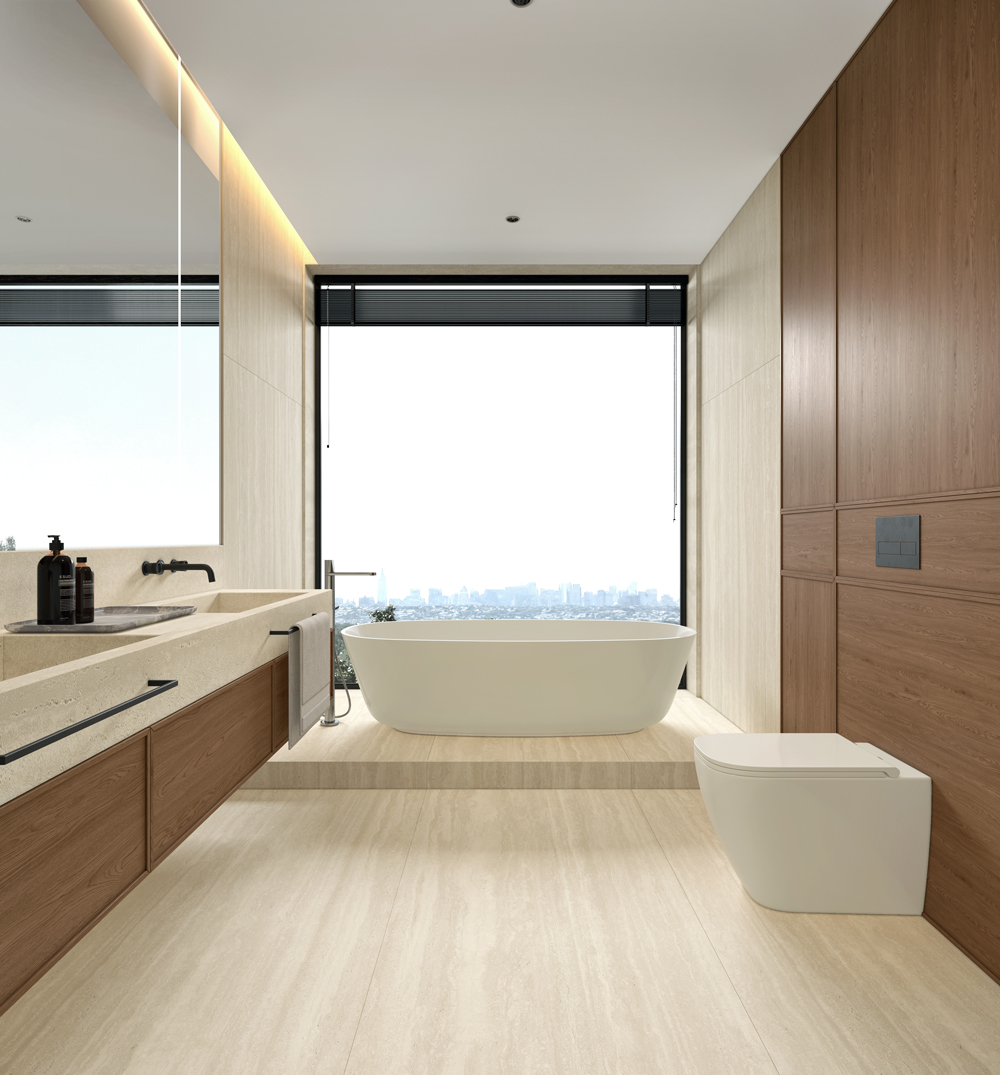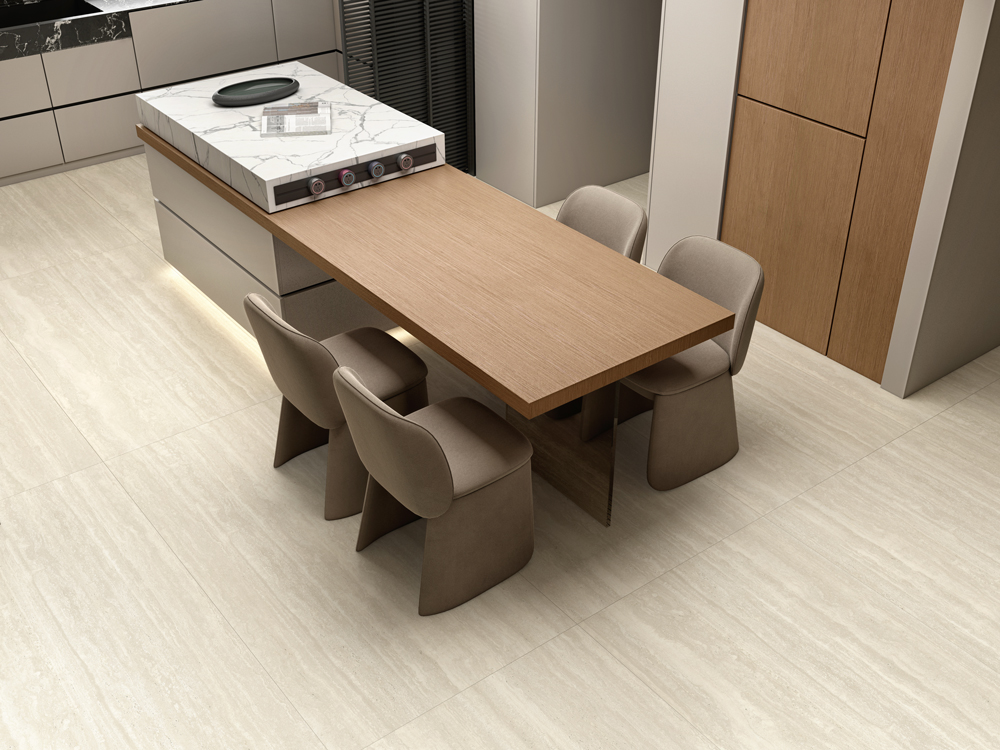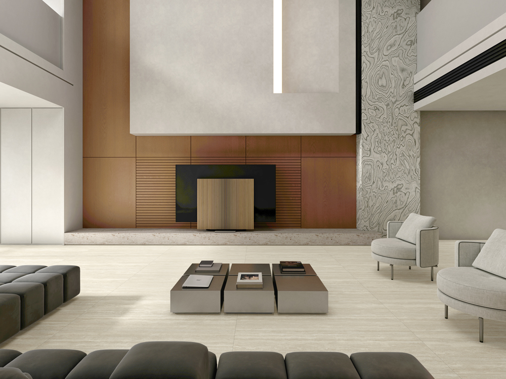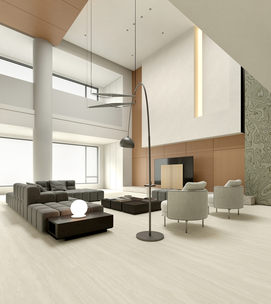 The combination of dry grain application and exclusive molds creates a delicately textured surface with subtle undulations, faithfully replicating the sophisticated feel of natural stone.