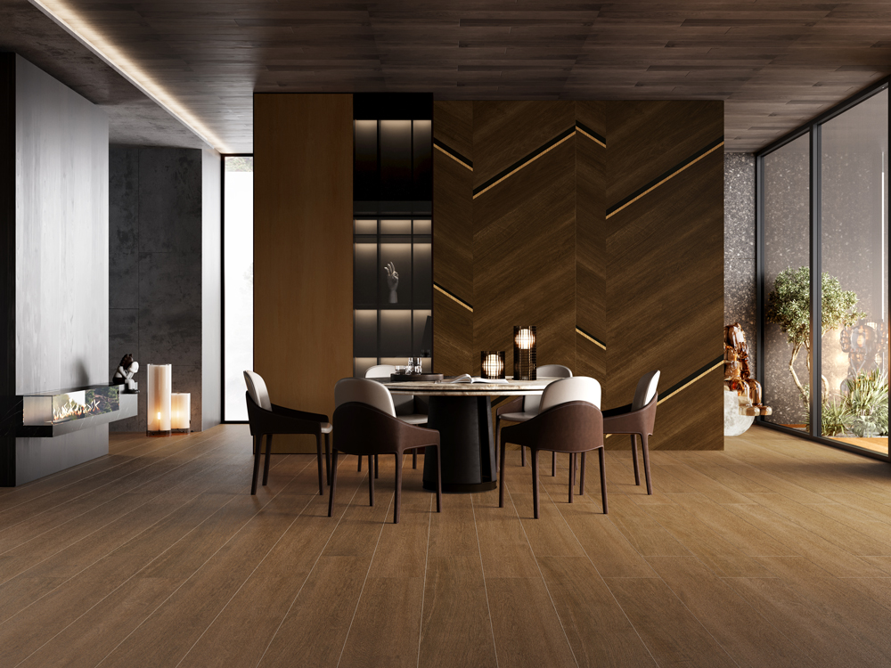 Our china wood-look tile Grid beautifully replicates the warmth and character of natural wood, offering a rich texture and intricate wood-grain patterns. What sets them apart is the infusion of exquisite gold elements, elevating these tiles to a level of unparalleled refinement.
