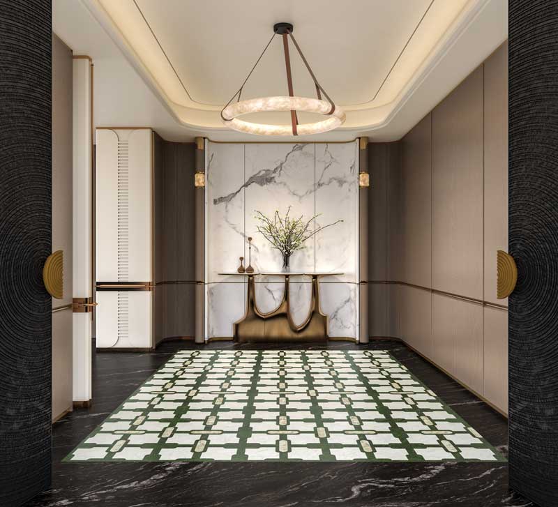 The dominant dark verdant green tone is complemented by light gray natural stone veining and accented with elongated oval decorative blocks in a soft beige. Together, they achieve the composed color palette of classical Chinese design—distinct in contrast yet harmoniously balanced.