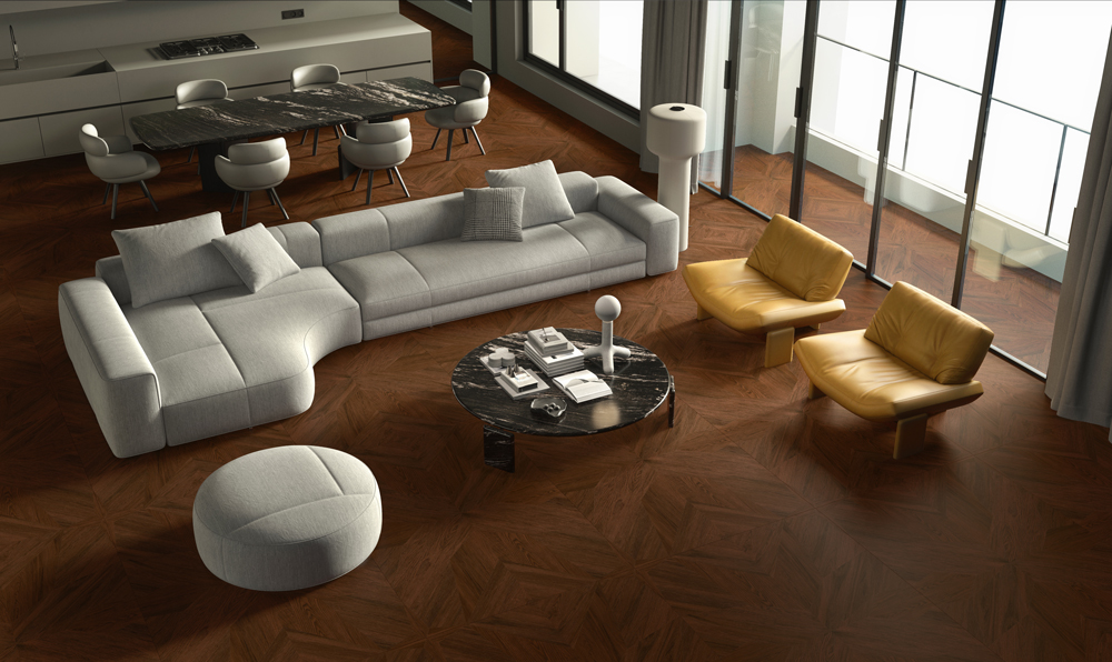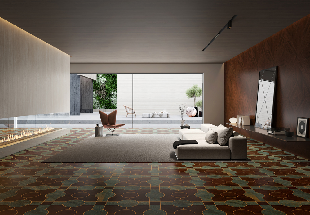 Infused with authentic Italian design DNA, the Majestic Oak series masterfully unites natural wood grains with artistic aesthetics. Deep burgundy and smoky brown tones intertwine through vertical striations and geometric inlays, creating a dynamic yet refined visual rhythm.