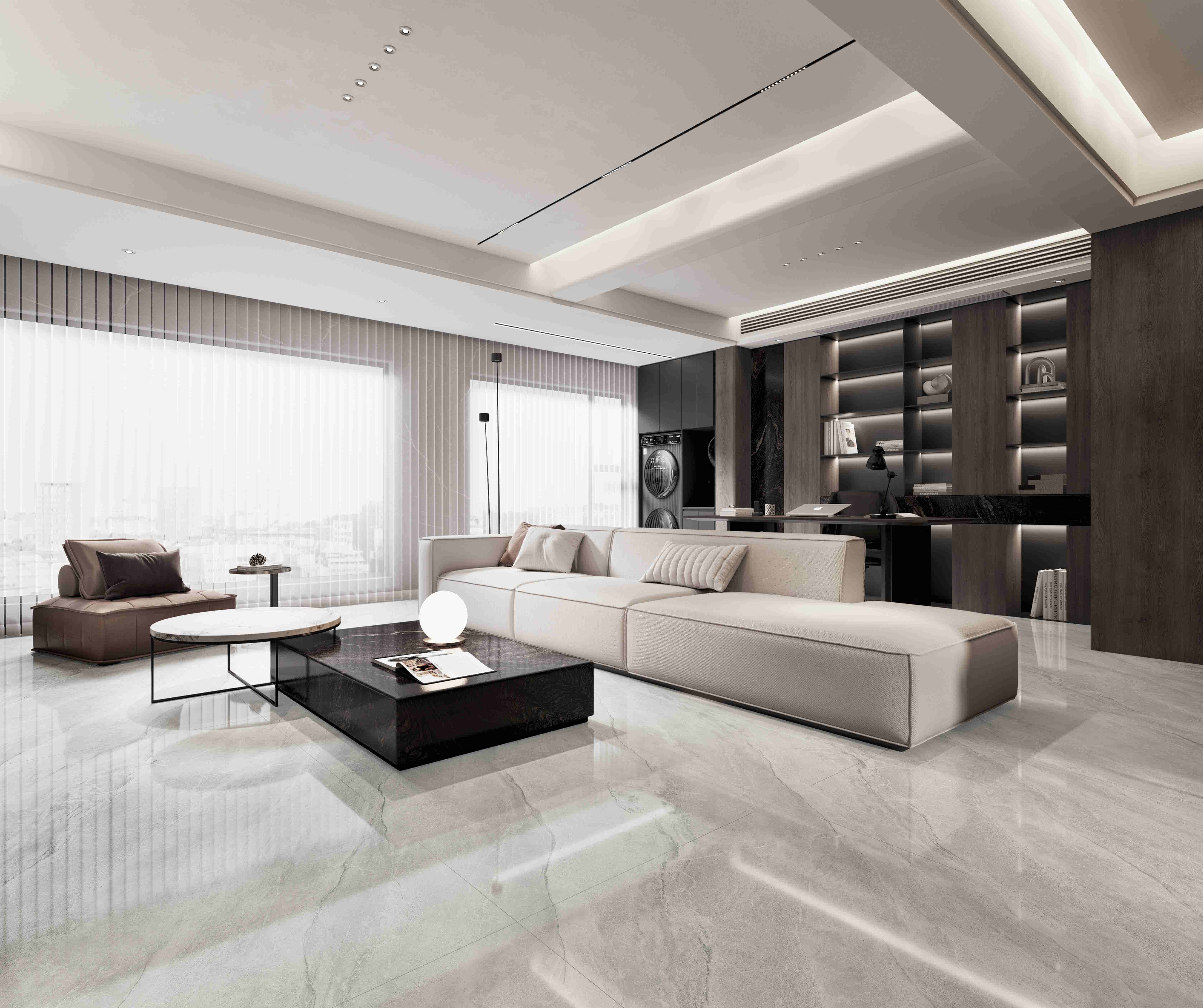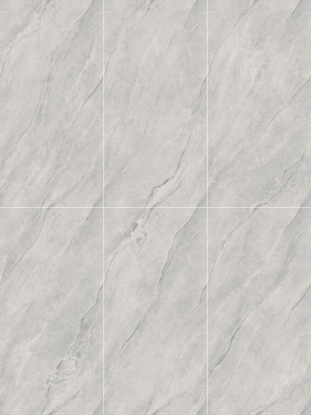 Gloss marble floor tiles Mist Grey features a natural, flowing wave pattern with irregular lines, authentically recreating the perfect form of marble. The gradient from light to dark gray creates a refined and elegant texture.