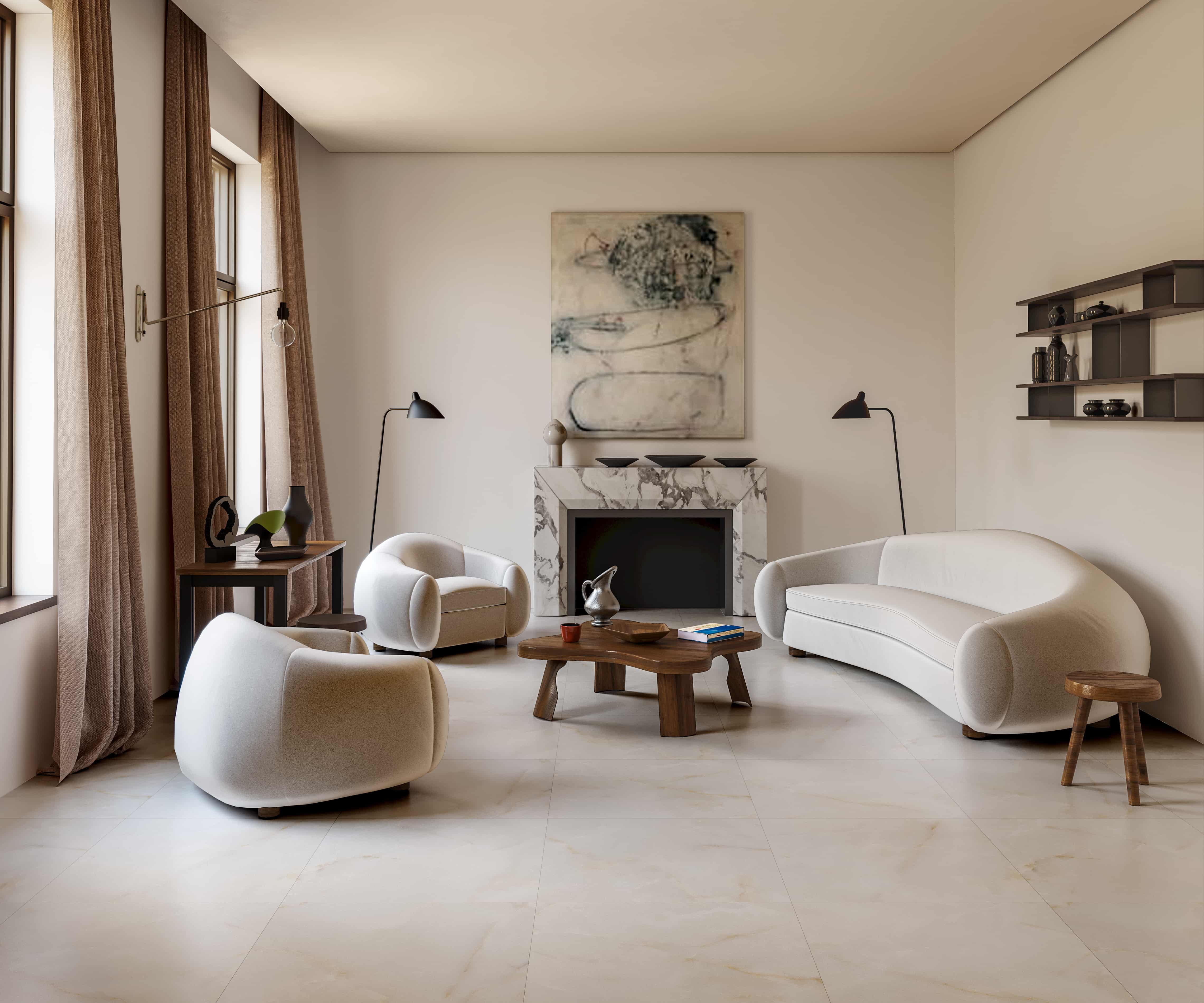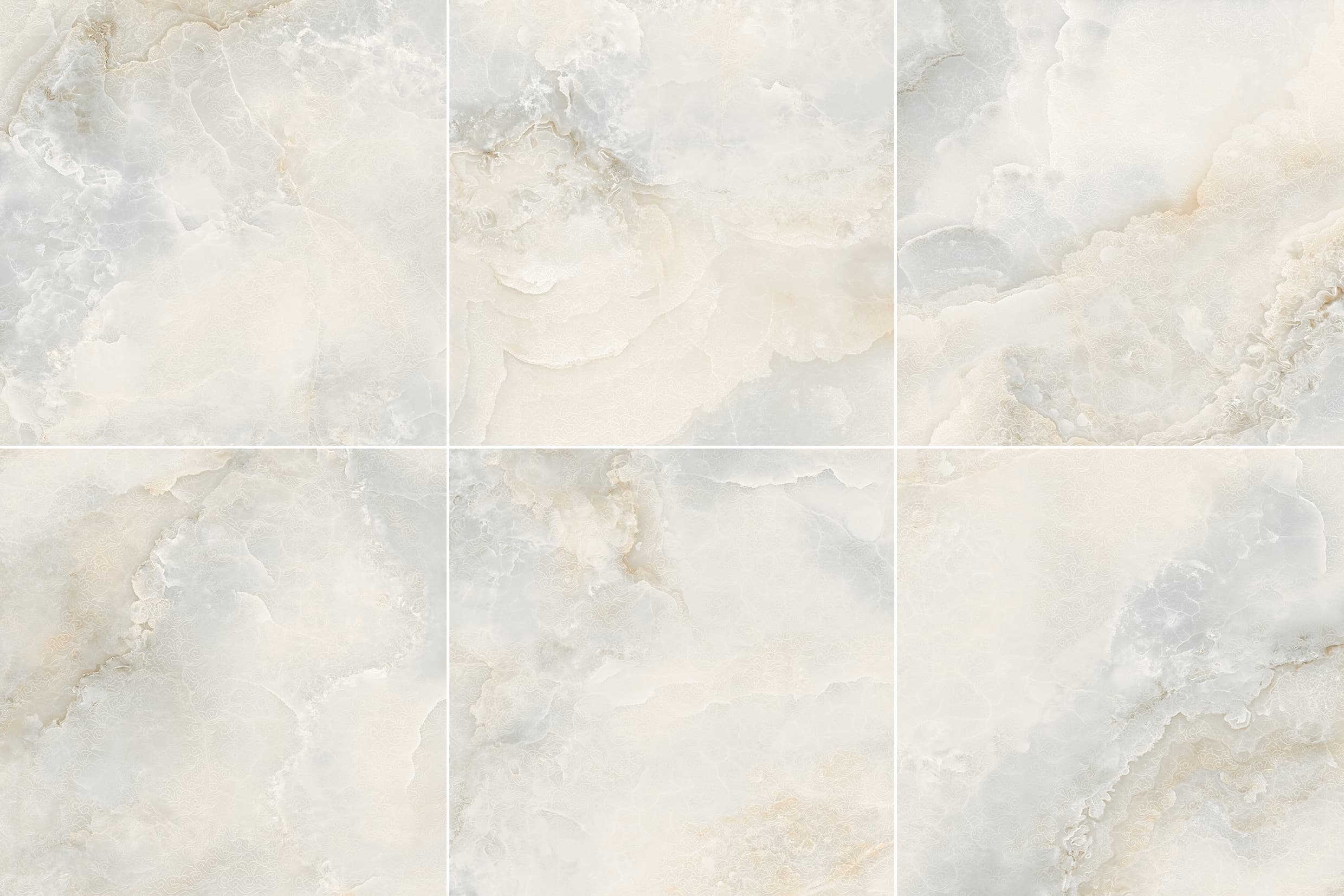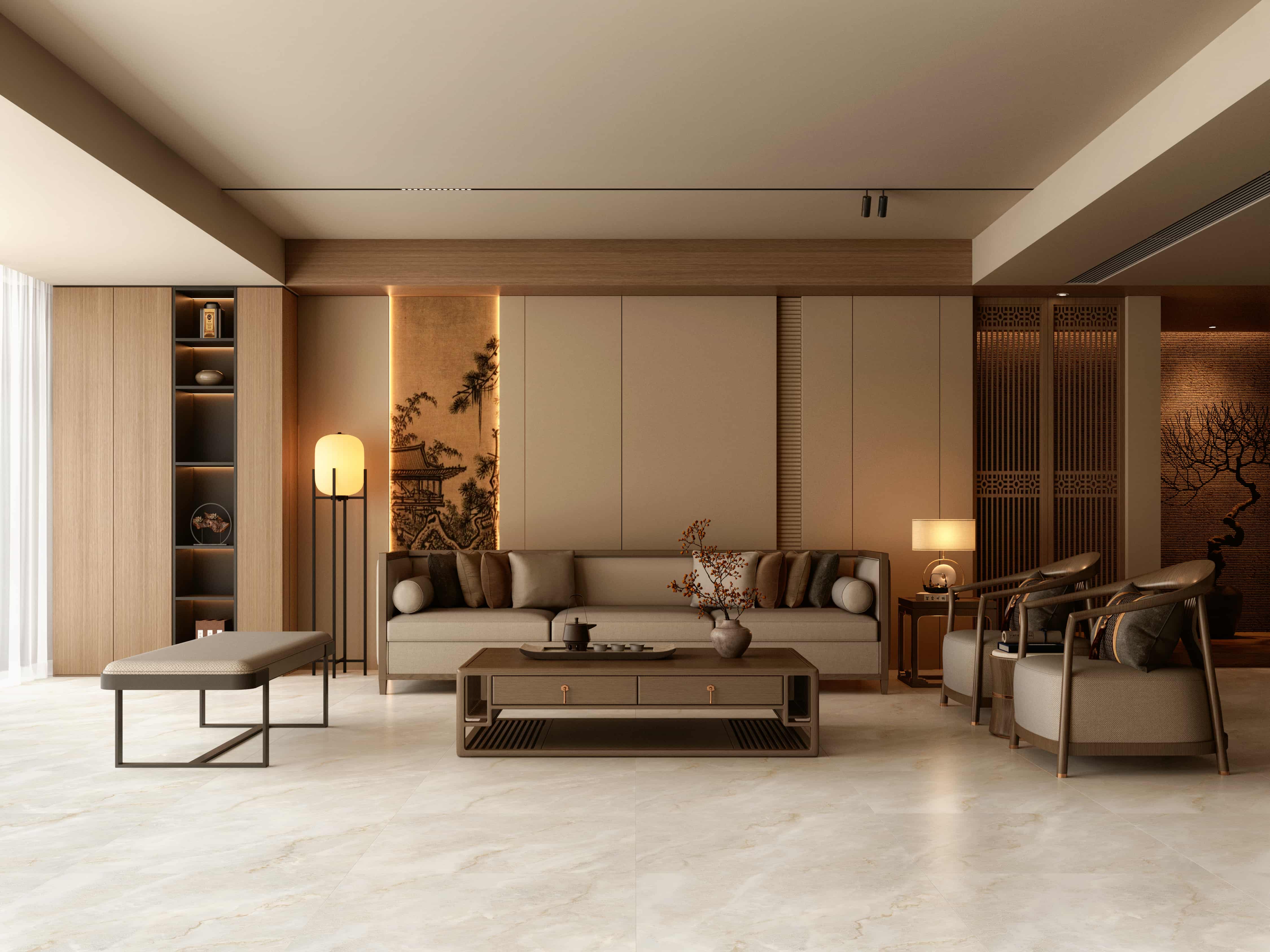 Bathed in a soft, low-sheen glow (13-30°), the palette unfolds in elegant shades of creamy white, warm apricot, and soft gold. Delicate golden veins and subtly embossed Ruyi motifs, reminiscent of ink diffusing effortlessly on rice paper, create a serene and artistic narrative.