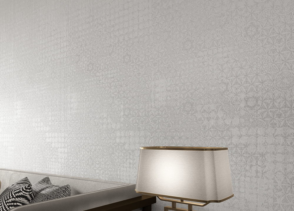 These tiles showcase an intricate pattern structure with diagonal lines and elaborate designs within the serene and luxurious silver-white woven texture.