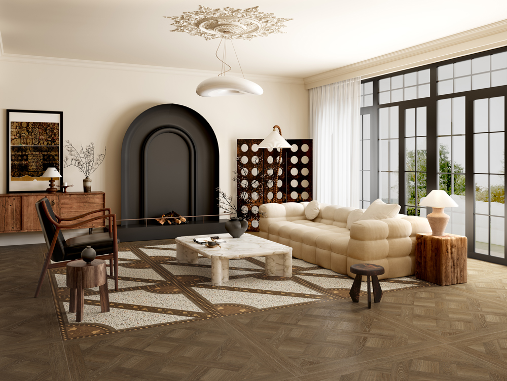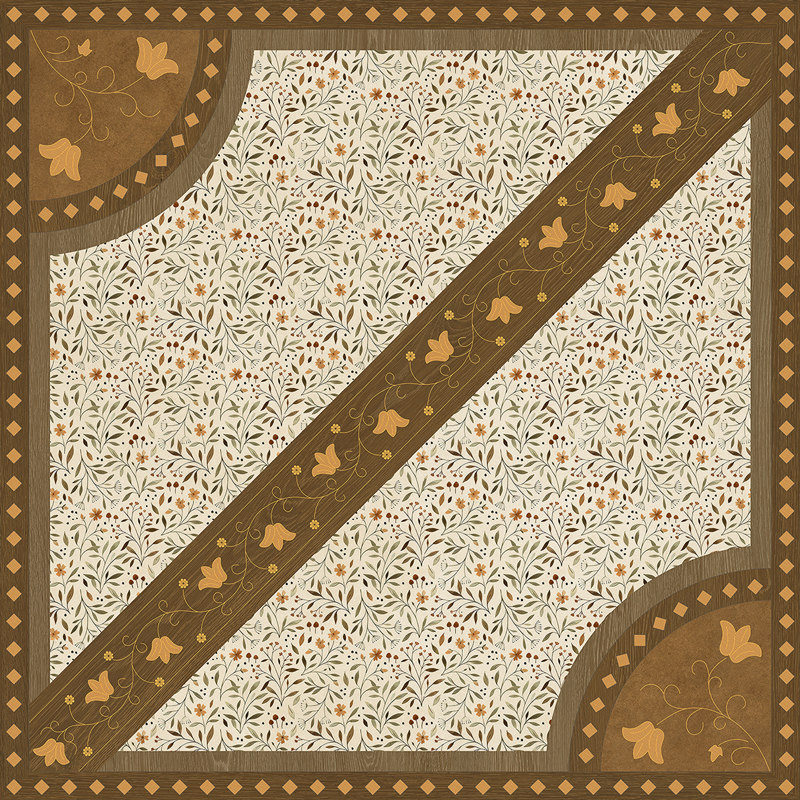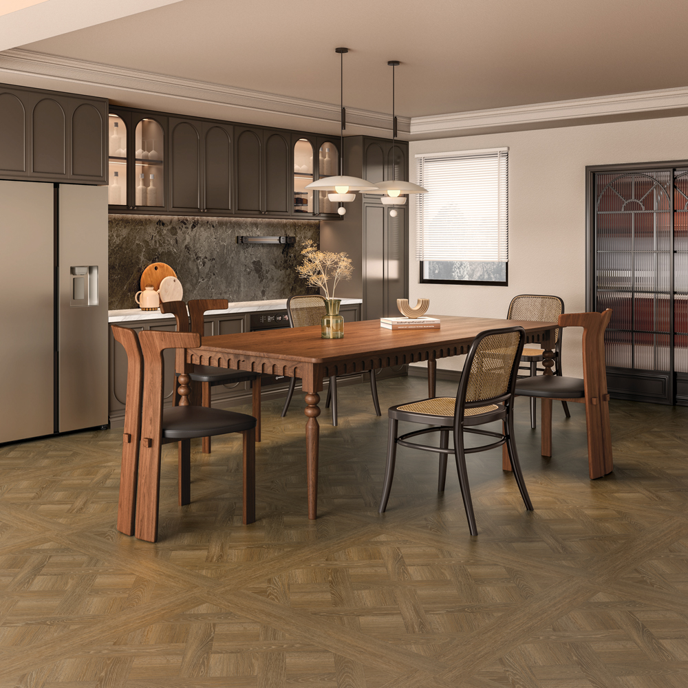 The main tiles are crafted from vintage walnut wood inlay, while the accessories feature Bohemian-style floral designs with intricate carvings, bringing a sense of French romance, luxury, and sophisticated taste.