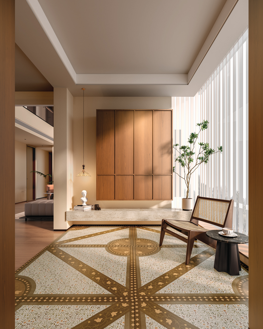 Measuring 1200x1200 square, the tiles are from the ceramic tiles company KITO. utilize simple lines to convey a pure and unique spatial style. The stone touch glaze technique vividly replicates the intricate details of wood grain, making the texture more realistic, three-dimensional, and lively. The touch is refreshing, and the surface is more delicate.