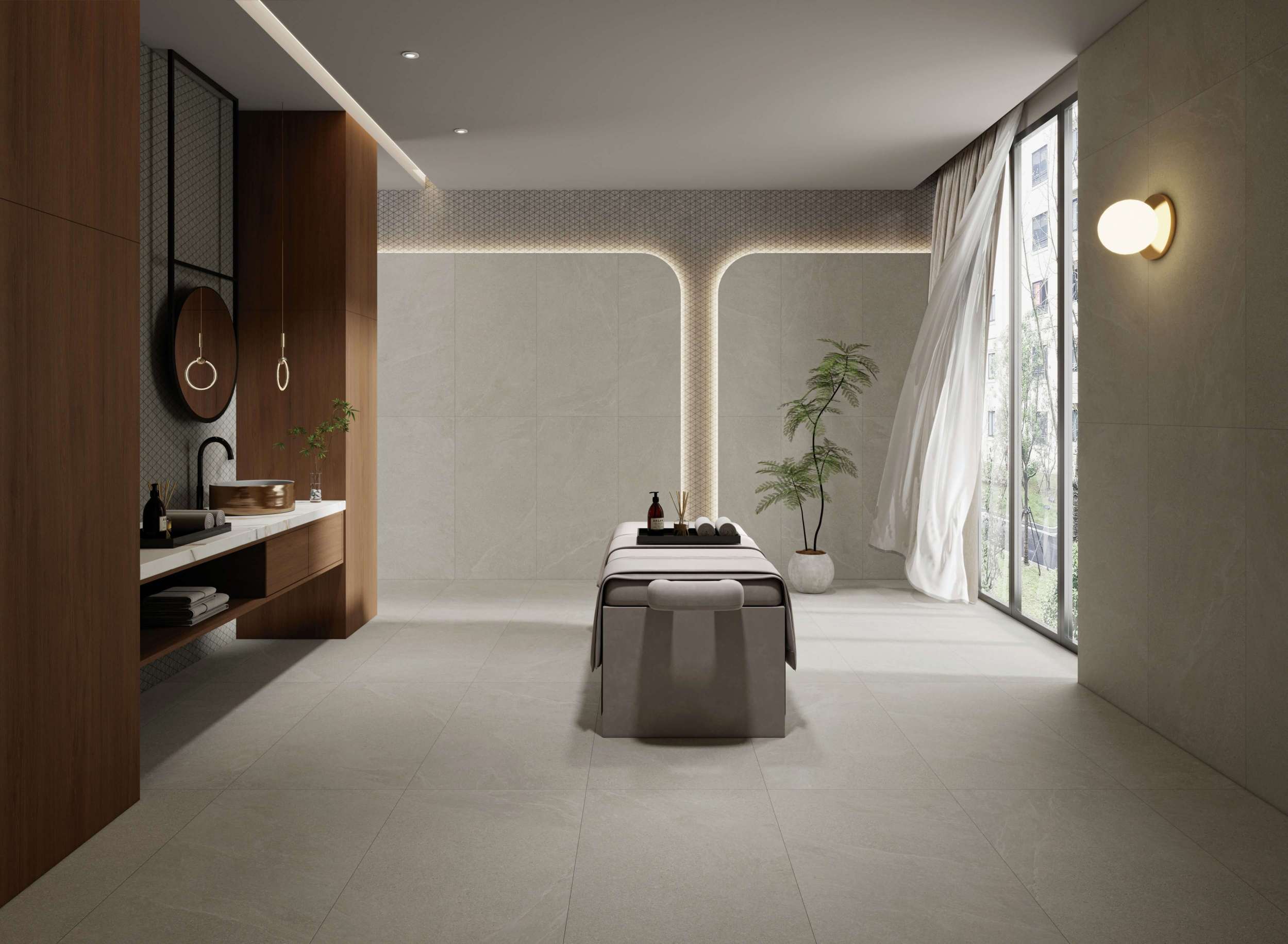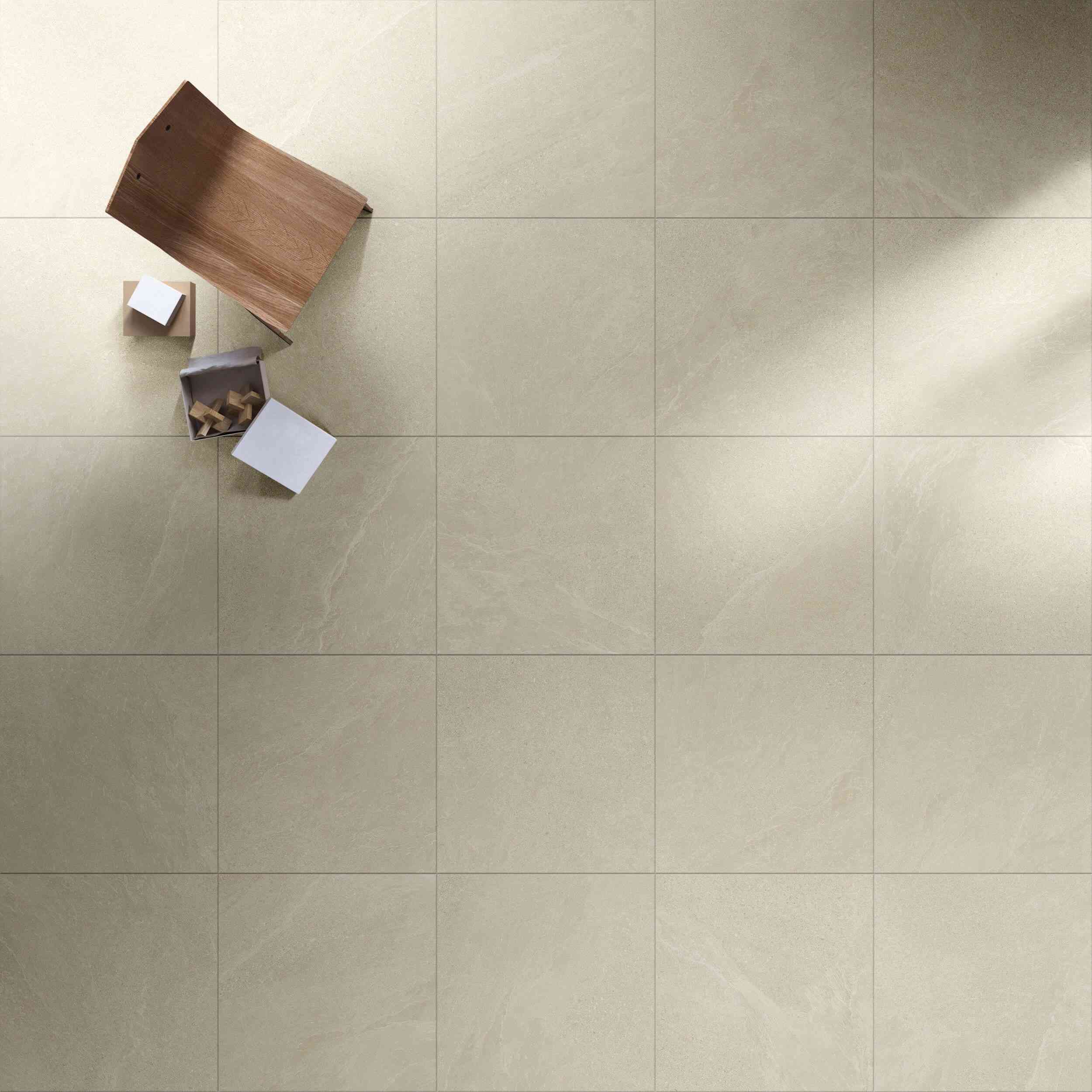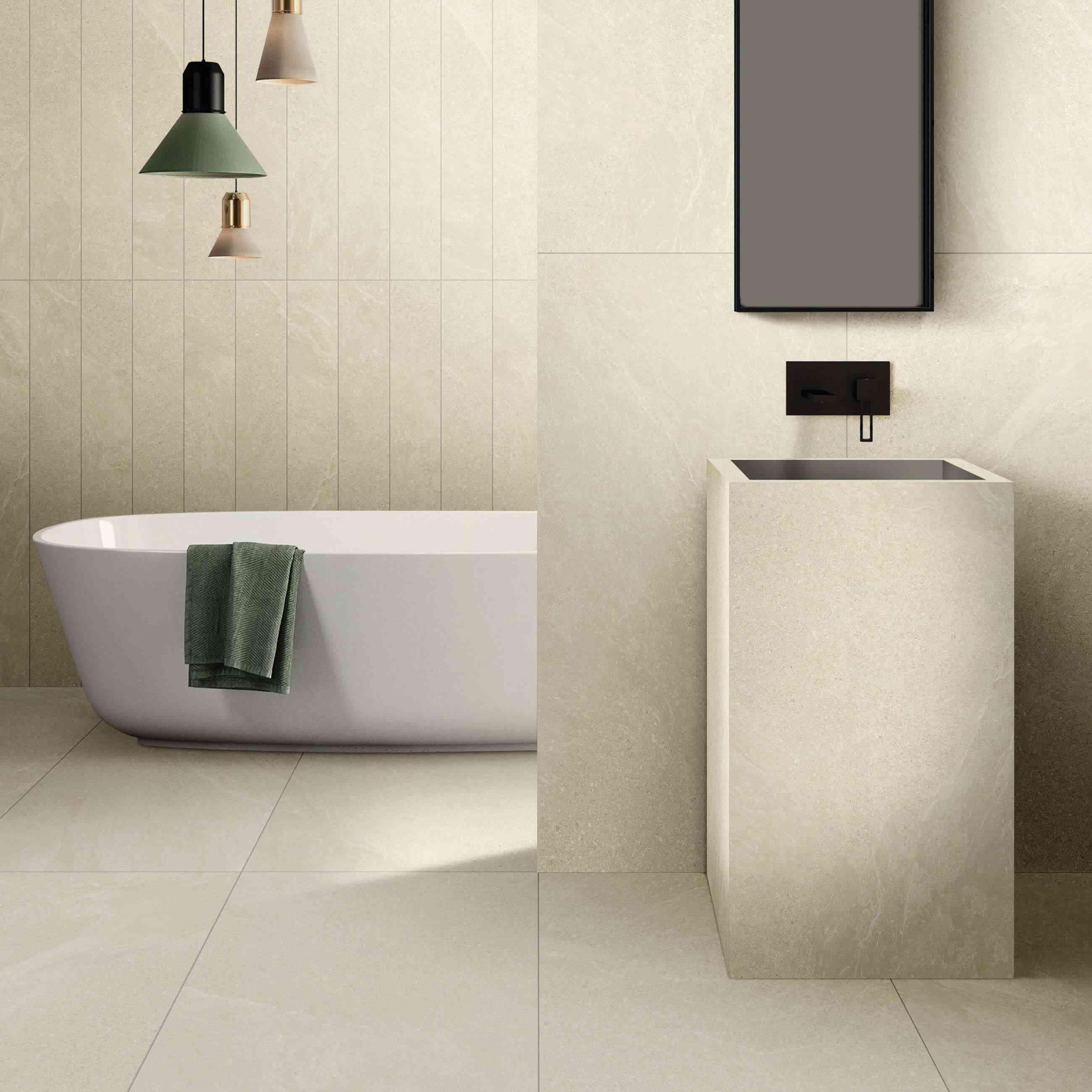 Matt glazed porcelain tiles Valles features a calm and understated color palette, with minimalist patterns that complement various styles. The elongated size is versatile for both wall and floor applications, and the beige and gray colors can be used individually or mixed.