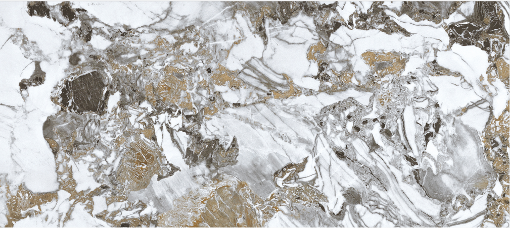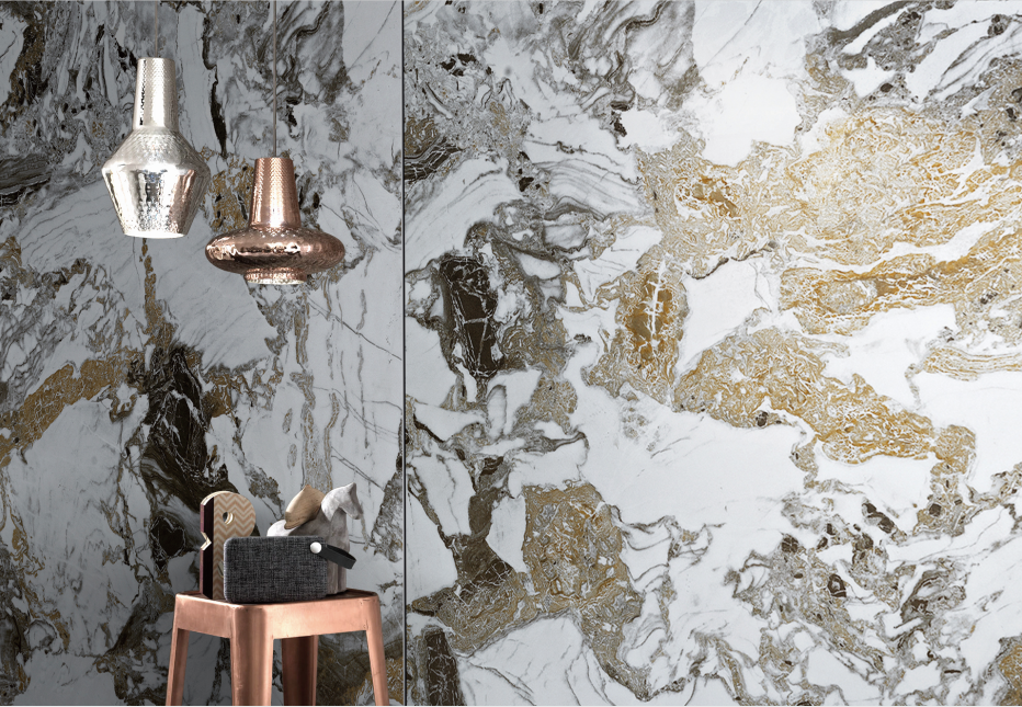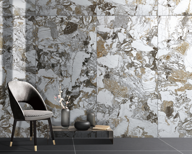 Sintered Slab porcelain tile features pattern integrating black, white and gold colors that are blended harmoniously like images evocative of floating cloud and flowing water.
