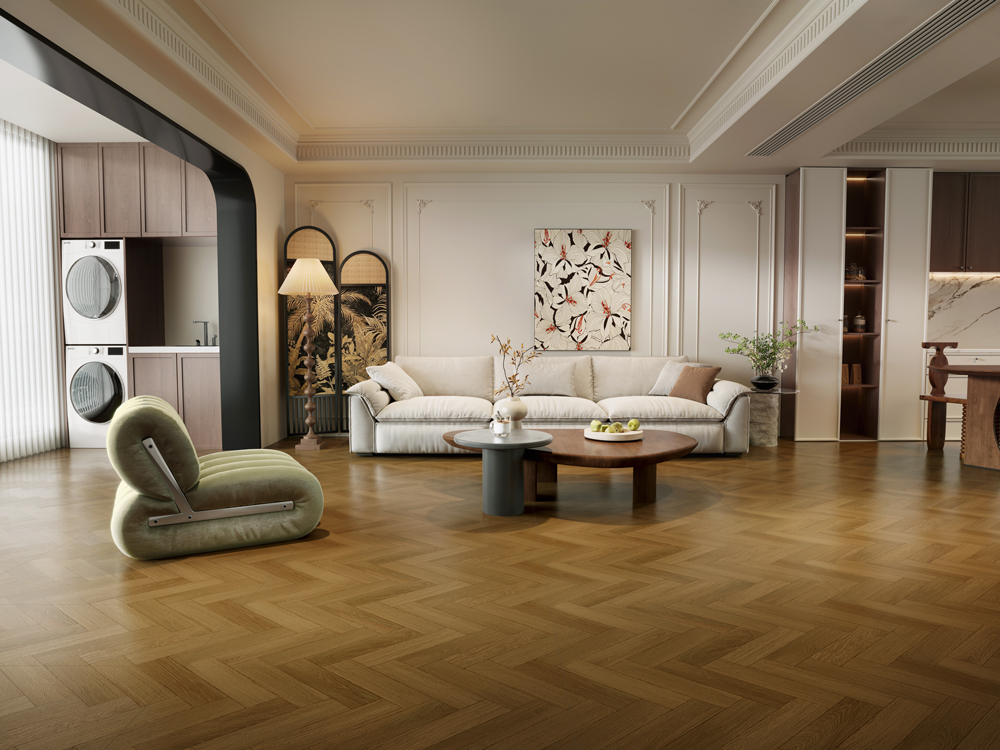 Drawing inspiration from the oak of England's thousand-year-old Windsor Castle, this Windsor Oak wood look tile collection features a classic herringbone pattern with a fine and natural texture. Combined with a micro-mold finish, the visual and tactile experience feels just like authentic wood grain.